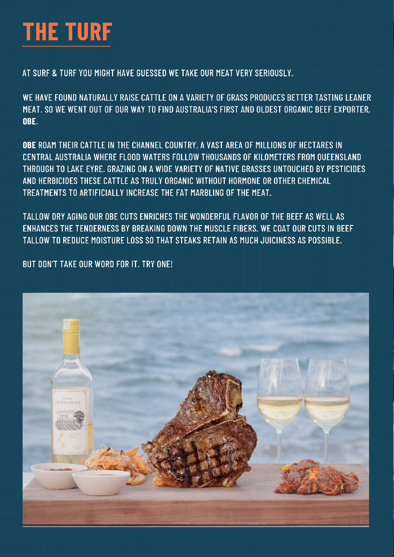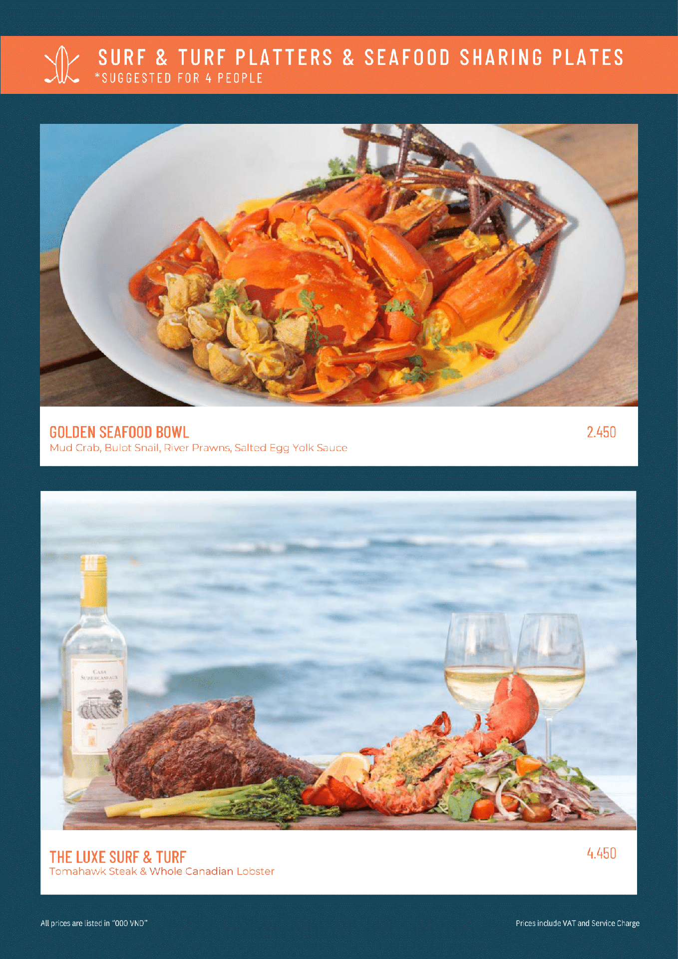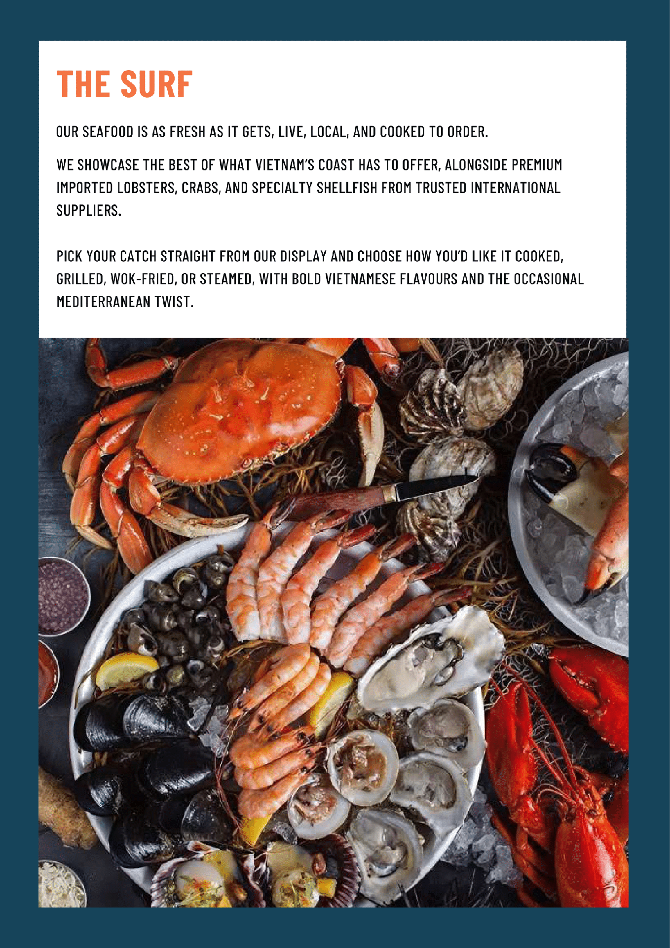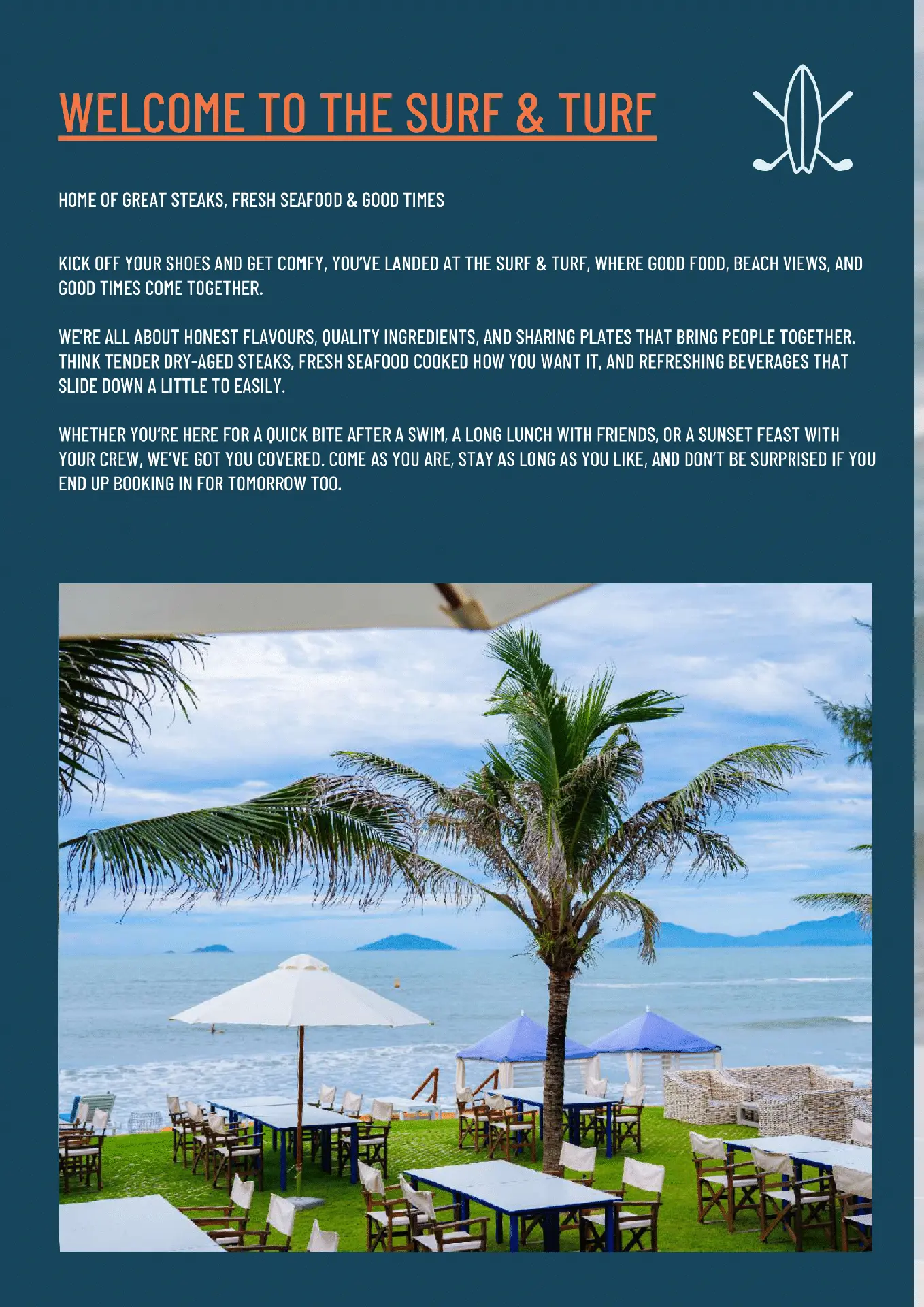At The Surf & Turf, our culinary philosophy is built on contrast and connection, land and sea, fire and freshness, tradition and innovation.